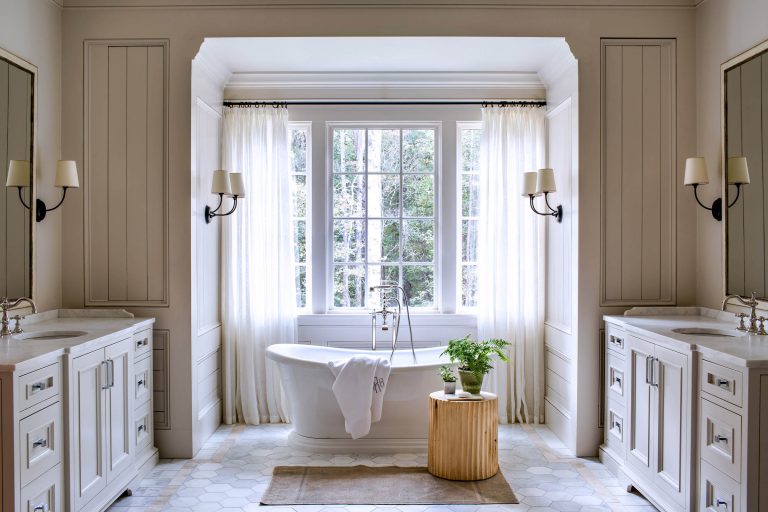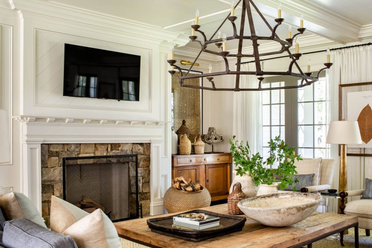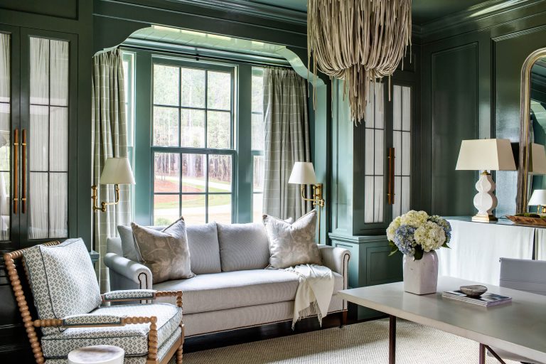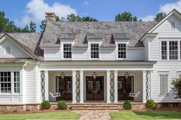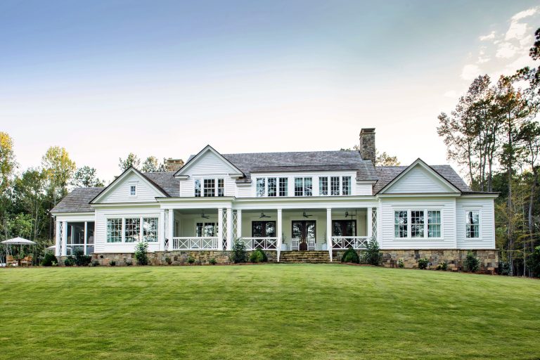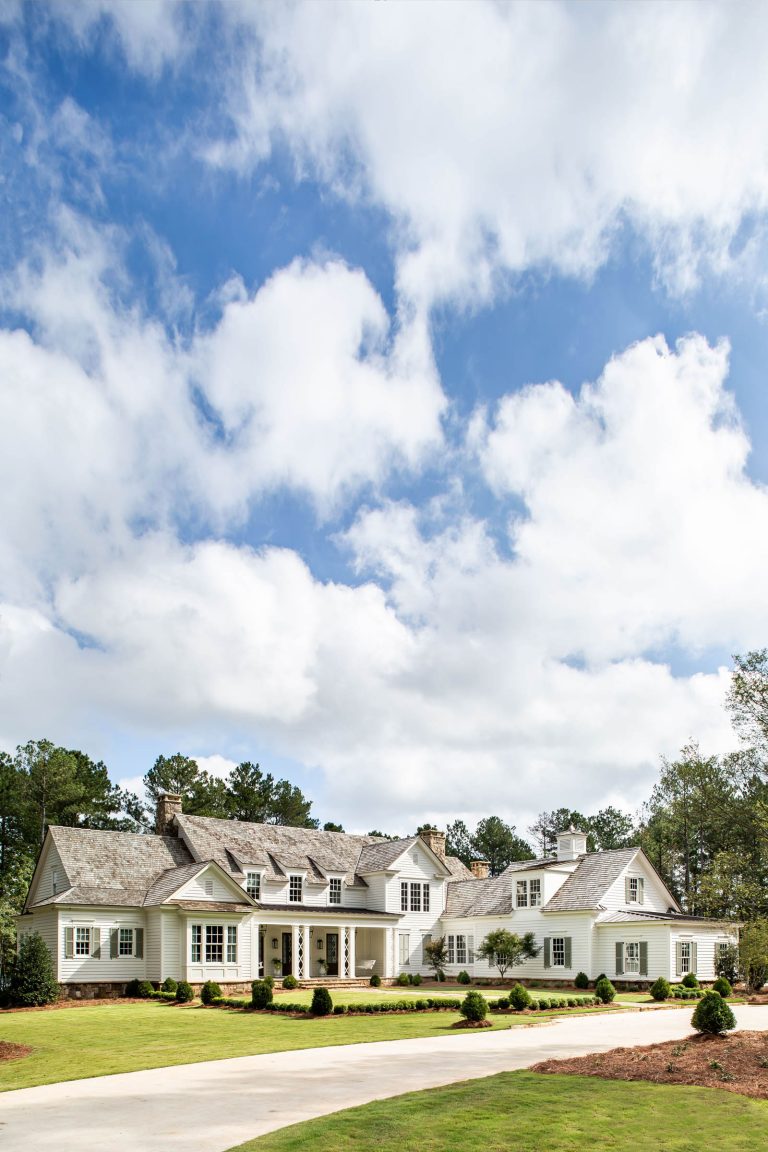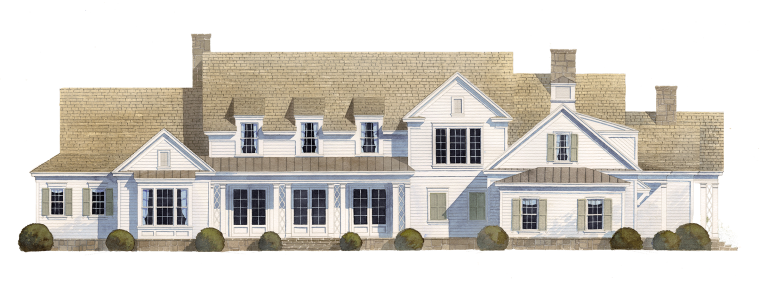 Our clients sought a relaxed but sprawling home on their beautiful lakeside site in Central Georgia for their young family. Drawing from precedents of classic American country houses, we captured a rambling spirit and low-slung but elegant attitude that marries the structure of the land. A relaxed exterior material palette of thick lap siding, fieldstone, and wood shingles is a complement to the organic footprint of the house, in which a side wing reaches forward to receive guests in a welcoming gesture at the end of the long, winding, wooded drive.